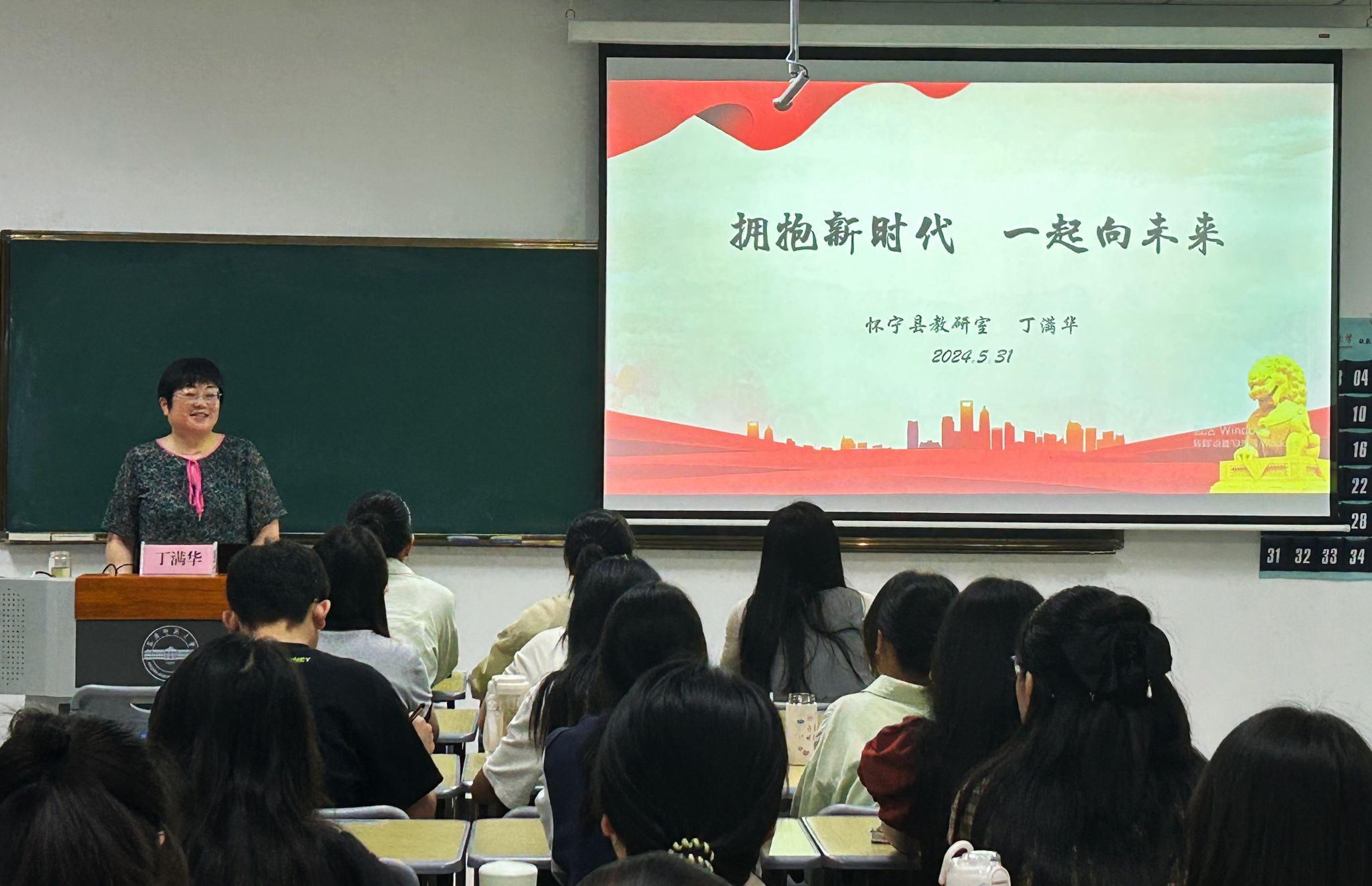 5月31日,安徽省模范教师、怀宁县教育局教研室中小学思政教研员丁满华老师应邀作客“校友讲堂”,作题为“拥抱新时代,一起向未来”的主题讲座,学院部分本科生、硕士研究生以及青年教师参加此次讲座。