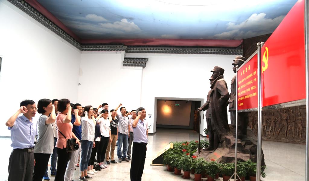 新四军军部在云岭近三年时间里,是新四军向华中敌后发展的关键时期。场馆内的大量历史图文资料和许多珍贵文物,全方位、有重点、多角度地反映了新四军波澜壮阔、光荣艰辛的战斗历程。在场馆大厅鲜艳的党旗下,学院全体党员面对党旗重温入党誓词,表达了不忘初心,继续为党的事业奋斗终身的决心。