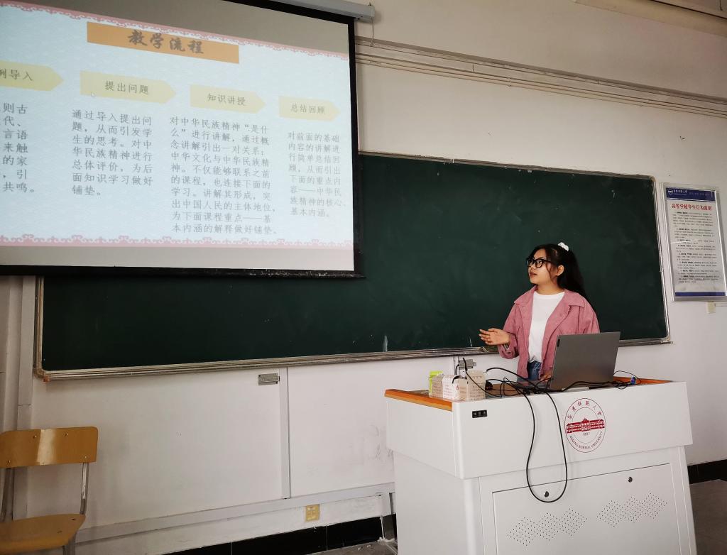 参赛选手围绕中学教材选题,精心设计教学环节,重点展示了教学导入、课程讲授、学生组织、教学媒体使用等教学技能。选手教学风格各异,或逻辑严密、循循善诱,或重点突出、以情化人,都呈现出精彩表现:华文君同学从知识本身出发,结合高中学生特点,围绕“建设文化强国”,引用现实数据,层层推导,引发学生自主思考;戴晓桐同学将党史学习教育融入课程,在传授知识的同时以红色革命故事引发学生共情共鸣,注重培养学生的“政治认同”素养;李春兰同学从抗疫精神切入,带领学生回顾中国抗击新冠肺炎疫情的斗争,进而引出中国共产党的领导是中国特色社会主义的最大优势。