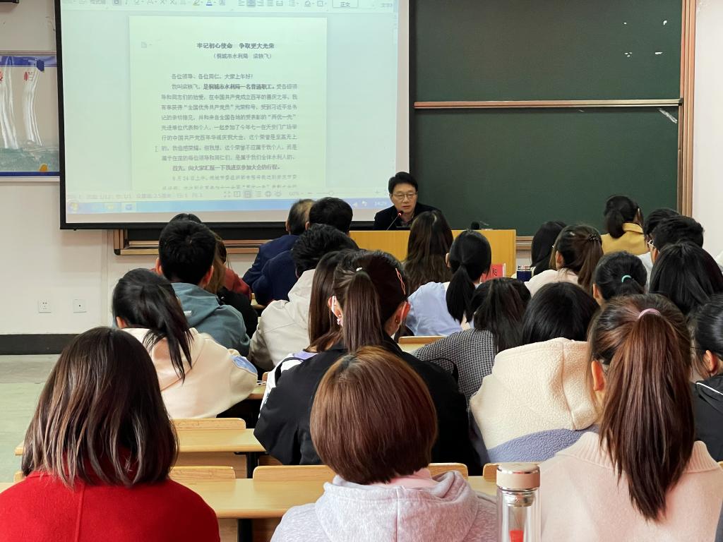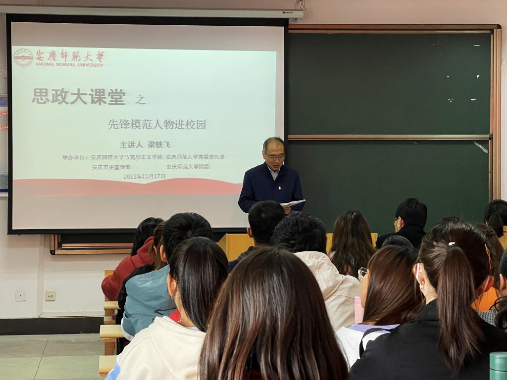 11月17日,beat365在线唯一官网、学校党委宣传部、安庆市委宣传部、学校团委举办“思政大讲堂之先锋模范人物进校园”专题报告会。全国优秀共产党员——安徽省桐城市水利局党组成员、水利局水保工程建设管理所所长梁轶飞受邀作报告,学院党委书记金文斌、学校团委副书记赵丽丽、学院团委副书记与120多名学生代表参加本次活动。