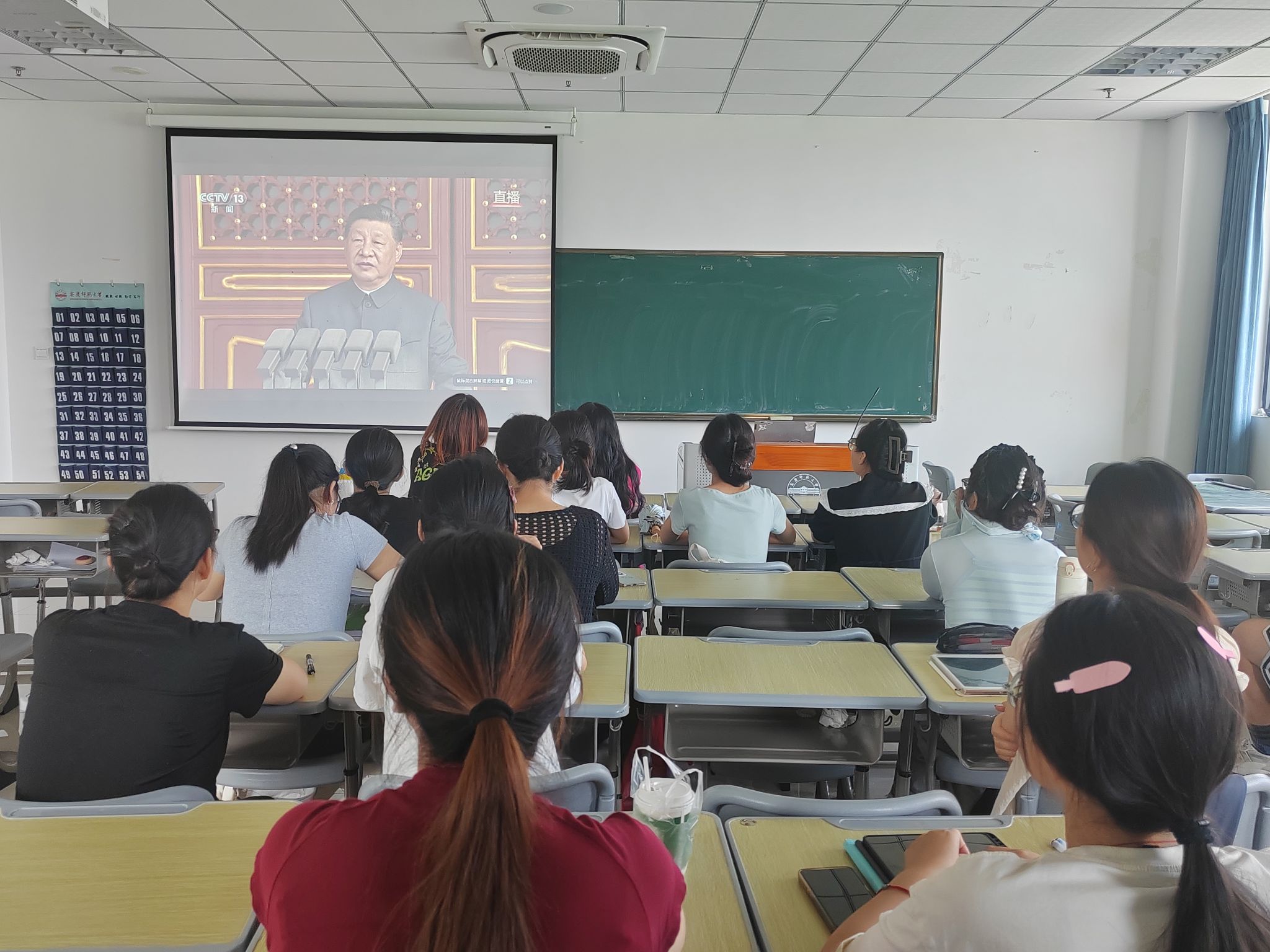 2025年9月3日上午,思想政治教育学生第一党支部在Q302教室集体观看纪念中国人民抗日战争暨世界反法西斯战争胜利80周年大会。
