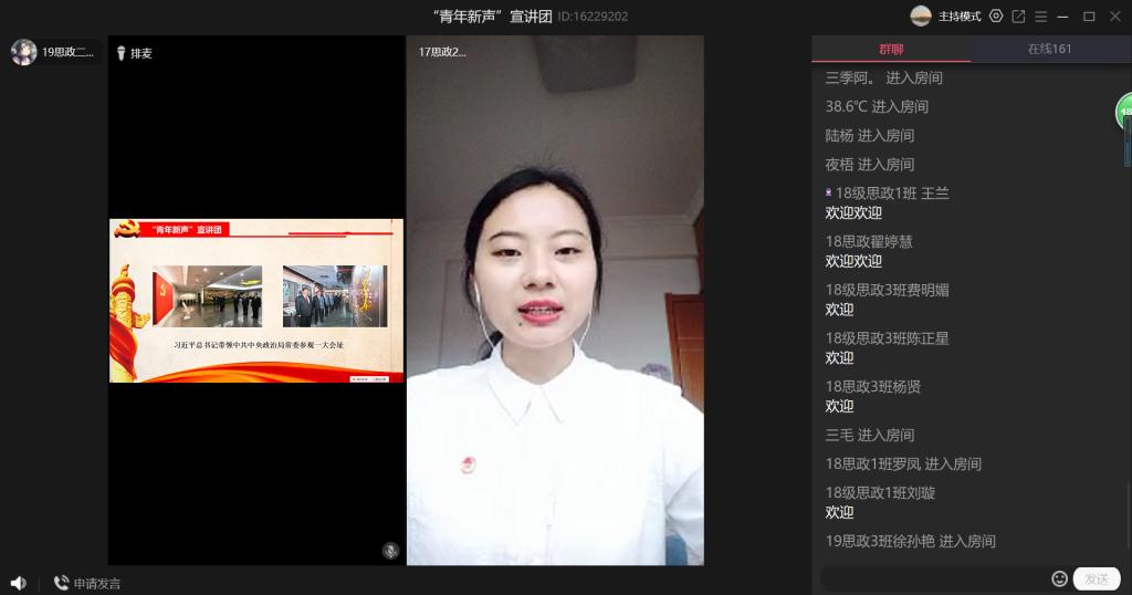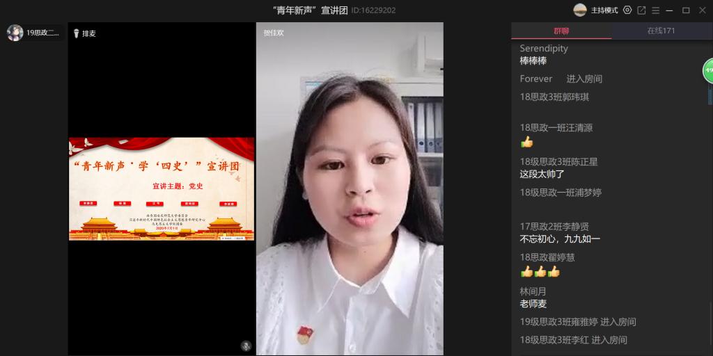 为深入贯彻落实习近平总书记关于加强党史、新中国史学习教育的重要论述,庆祝中国共产党成立九十九周年,7月1日,我校“青年新声·学‘四史’”宣讲团围绕中国共产党成立的背景及党的一大,开启“云端”第一讲。宣讲活动由beat365在线唯一官网本科生党支部书记主持,beat365在线唯一官网党员、研究生、本科生收看了本次宣讲活动。