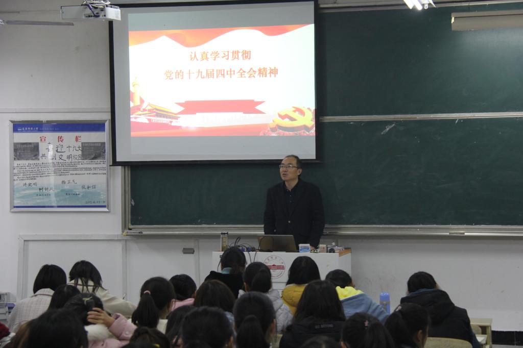 2019年11月26日,在教学楼A楼201教室,beat365在线唯一官网金文斌教授为思想政治教育专业2019级学生宣讲党的十九届四中全会精神。