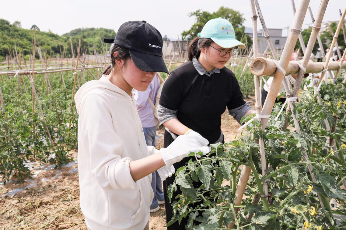 “这是植物的花,主干和叶子中间是侧芽,你们要学会用指甲掐。”江国向学生们详细讲解为番茄整枝的技巧。思想政治教育专业2023(3)班的李晴晴站在最前排,将要点默默记在心里。她“慧眼识芽”,指尖一掐便迅速摘下一个侧芽,利落的动作引得阵阵赞叹。“刚开始没有理解老师的意思,我决定主动上手,没想到获得了理想的反馈。”她感叹,看来只有通过实践才能真正掌握知识。