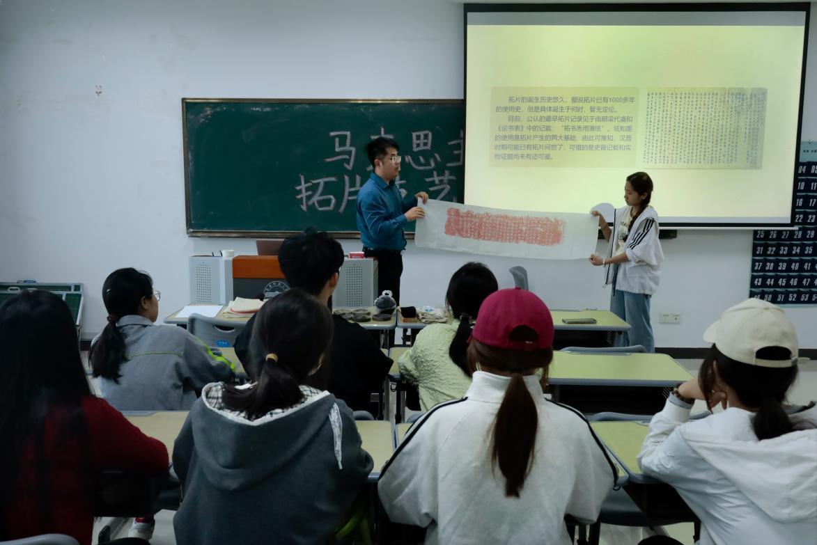 “拓片技艺传承至今,纸在拓片制作中扮演者不可或缺的角色,不同的纸张它所带来的效果也有差异。”教师朱氤鹏化身拓片文化的引路人,为学生们讲解书法拓片起源、发展以及其主要的内容与形式。谈及书法拓片传承的核心要点时,朱氤鹏表示,他希望通过此次课程,让学生能够深入感受拓片技艺的精妙之处,在心中种下探索拓片技艺的种子。
