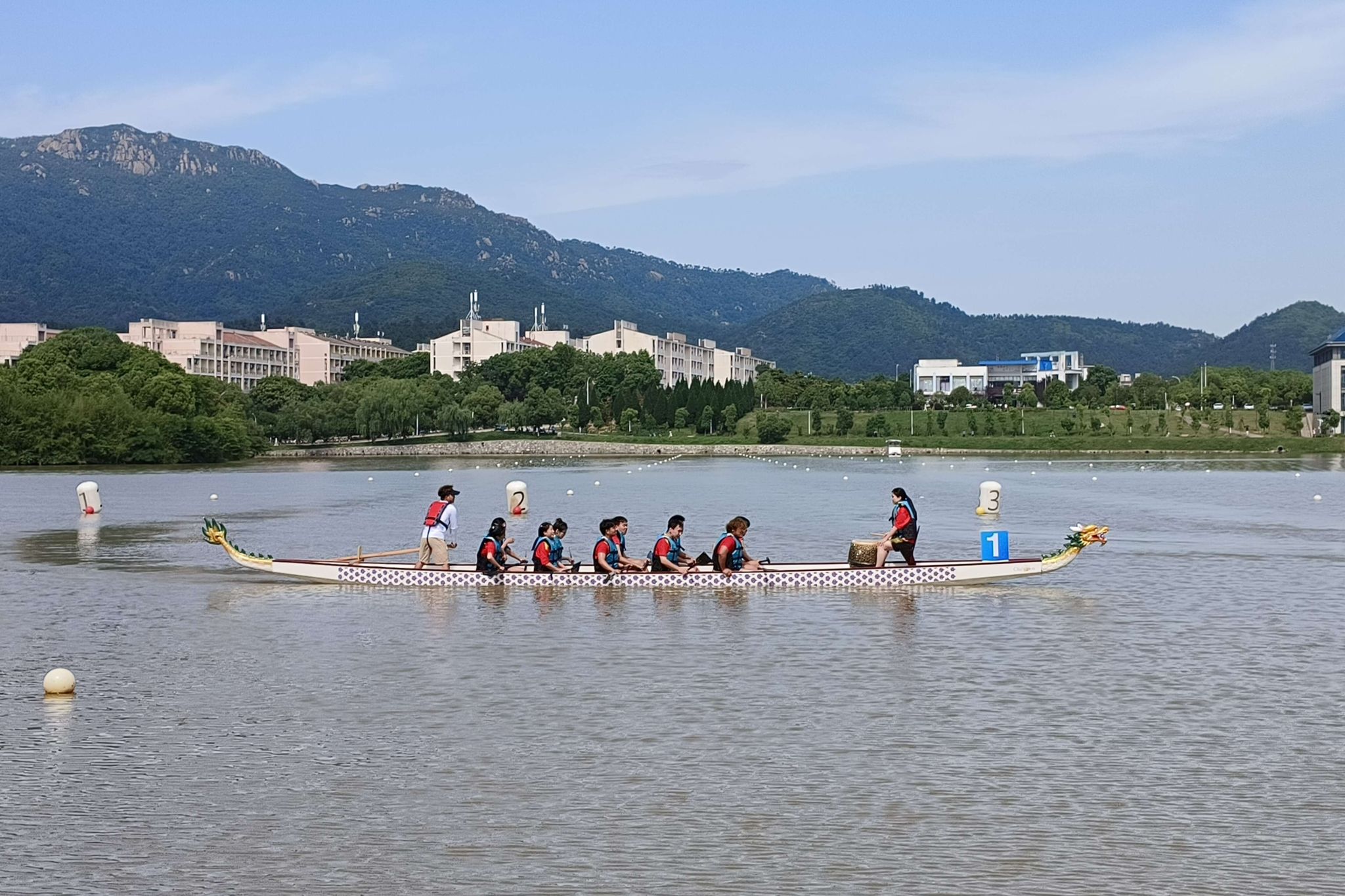 比赛时,学院龙舟队全体队员奋楫破浪,伴着咚咚鼓声与口号,队员们挥臂划桨、齐心发力,拼尽全身力气,随着鼓声节奏全力划动。随着比赛的推进,龙舟队伍之间的差距逐渐拉开,学院龙舟队员们气势如虹,划桨的频率越来越快,他们将优势保持到最后。最终学院龙舟队不负众望获得了两次小组第一,赢得观众的阵阵喝彩,赛出学院的风采。