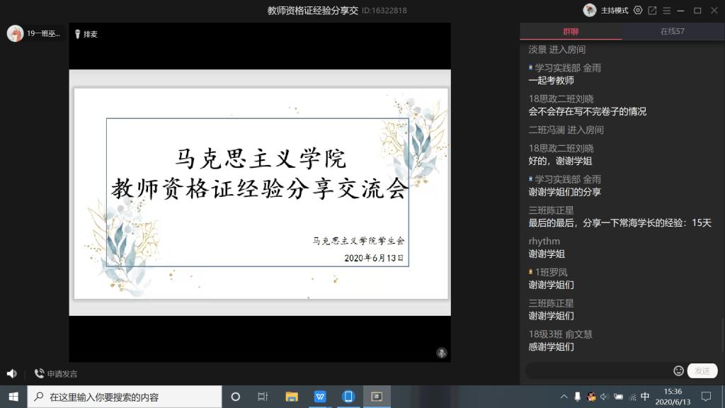 6月13日,beat365在线唯一官网举办线上教师资格证考试经验分享交流会,参与此次交流会的有学院思想政治教育专业2017级部分优秀学生代表、团委负责人及各班学生,实时在线人数200多人。
