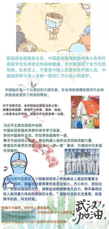 与此同时,各班团支部也紧扣回信内容,充分发挥主观能动性,采用不同的形式开展线上主题学习活动。思想政治教育专业2019级2班团支部以“学习回信精神,担当复兴大任”为主题召开团日活动,主要从回信内容、青少年对于构建人类命运共同体应该承担的时代责任以及中国于疫情期间展现出的大国担当等方面进行交流。思想政治教育专业2018级3班团支部在班级学习小组进行宣传,展开充分交流探讨,并统计各组学习情况。思想政治教育专业2018级3班黄佳表示,“从习近平总书记的回信中可以看出中国一直秉持着人类命运共同体理念,在这次疫情期间,一直贡献着自己的力量为全球疫情做贡献。对在华外国友人予以一视同仁的关心和爱护,这让我非常感动,增进了国人的民族自豪感。”“一方有难,八方支援,全力以赴,共克时难。打赢这场疫情防控战,需要世界各国青年同心同德同向,世界万众一心,推动构建人类命运共同体,就没有翻不过的山、跨不过的坎。”这是思想政治教育专业2019级3班林琼的心得体会。