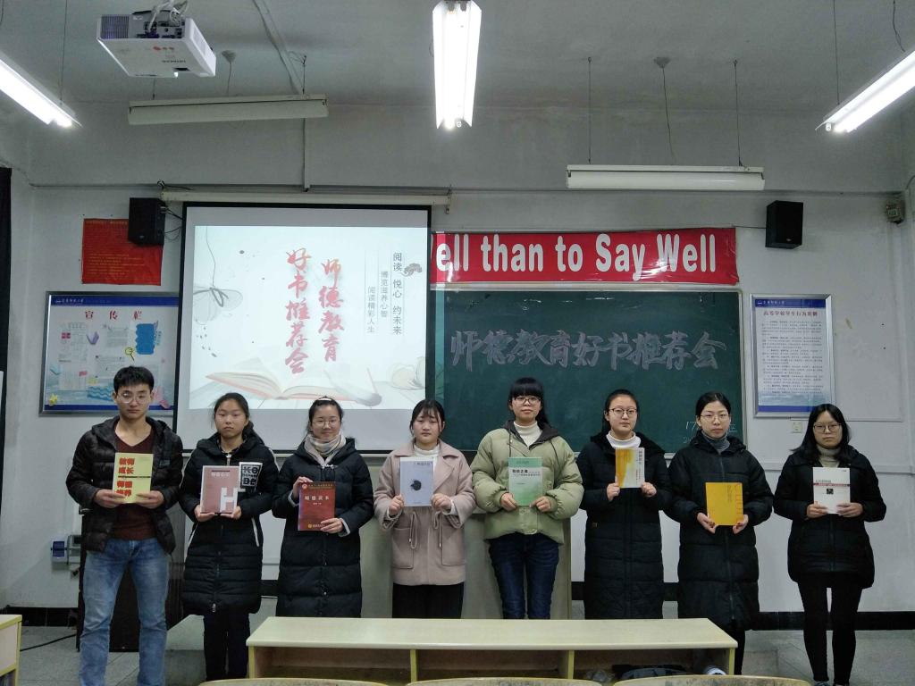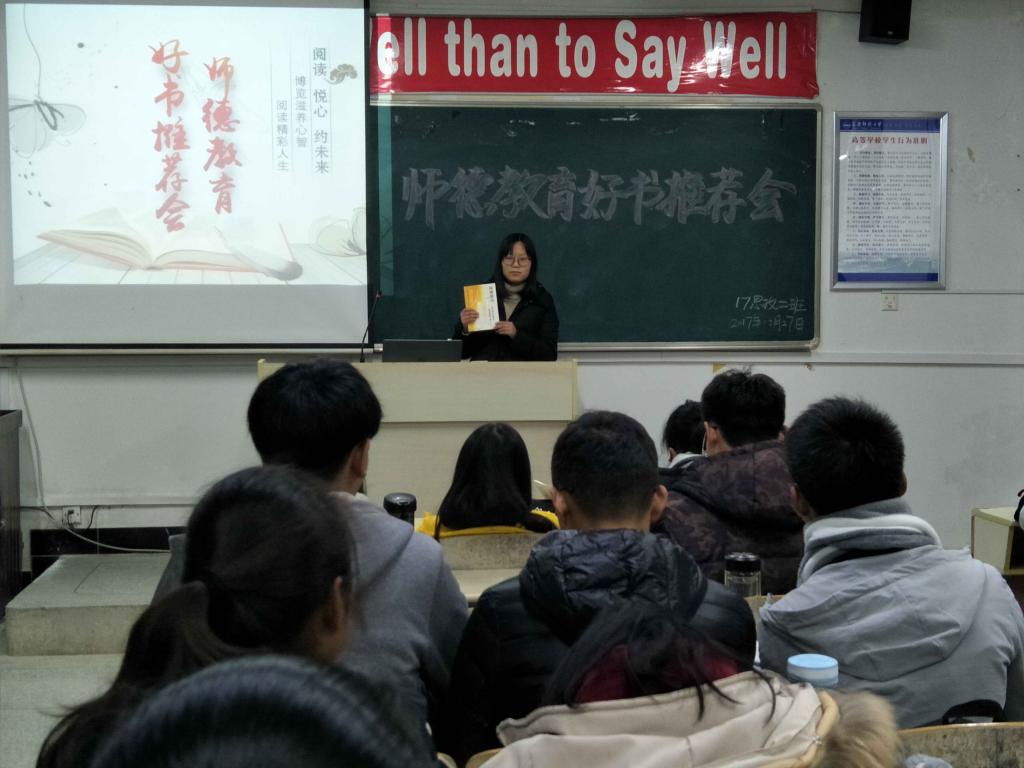 12月27日晚,我院2017级思想政治教育二班团支部举办的师德教育“好书推介会”在B107教室顺利举行。推介会由班级学习委员主持,班级全体同学积极参与。